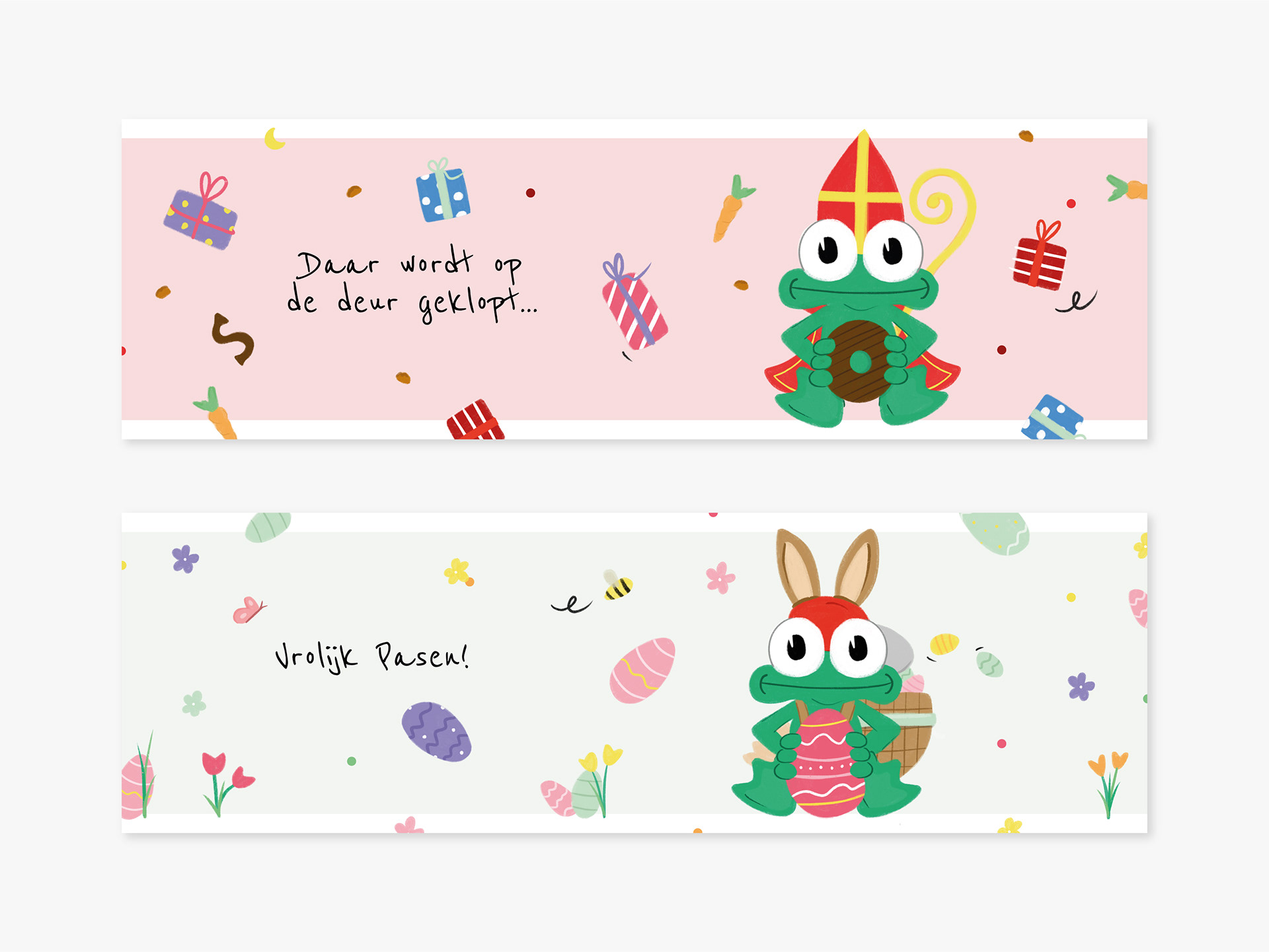 Verschillende illustraties voor Stichting Opkikker. Deze zijn gebruikt voor kaarten, headers voor de website en productlabels.