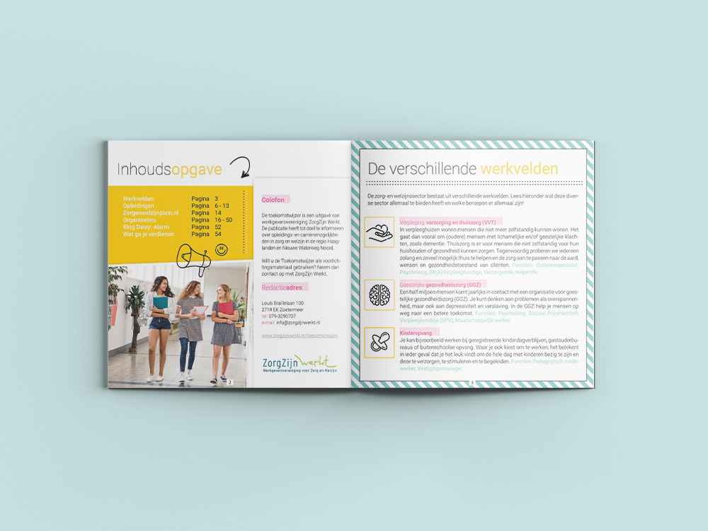 Ontwerp van een brochure gericht op jongeren op middelbare scholen.
